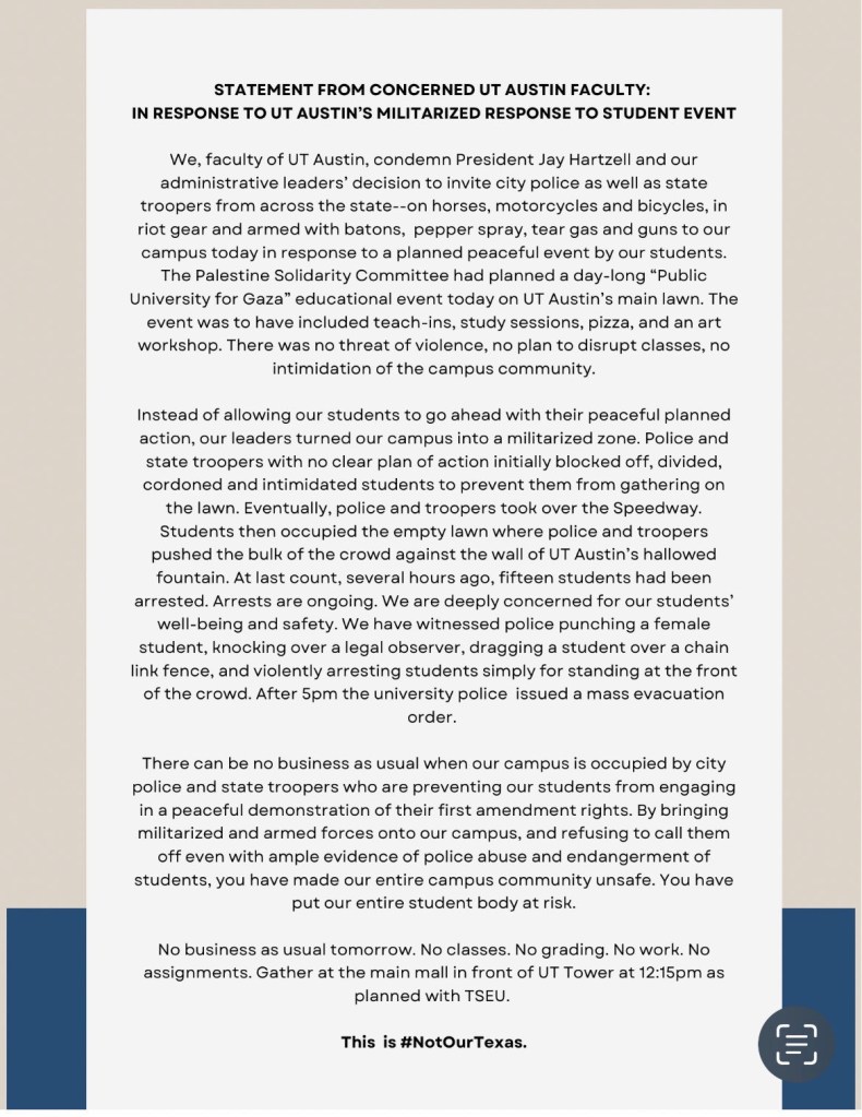 Immediate: UT Faculty Oppose Repression of Pro-Palestinian Activists on Campus, April 24, 2024: